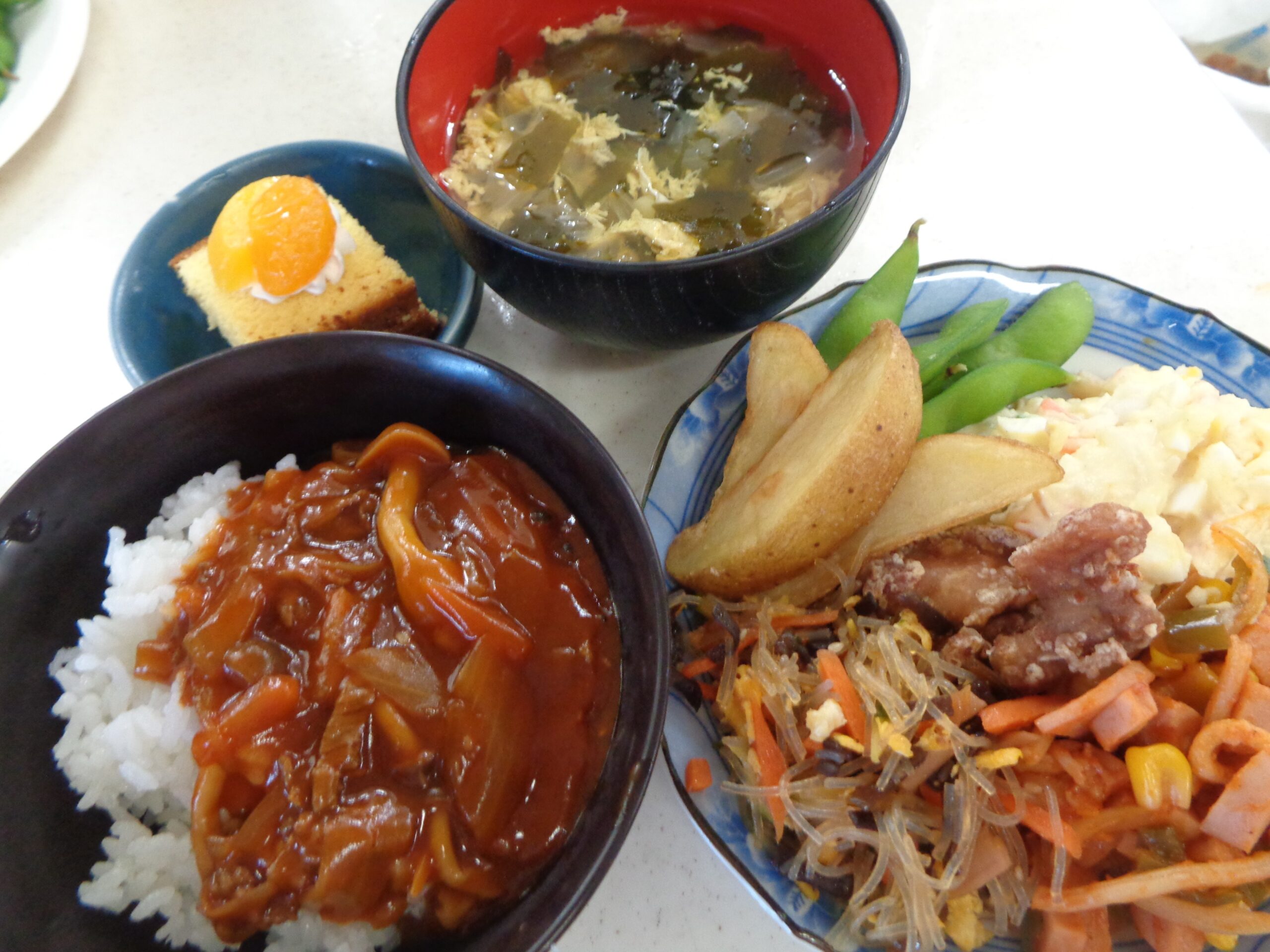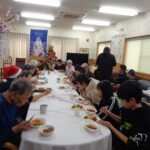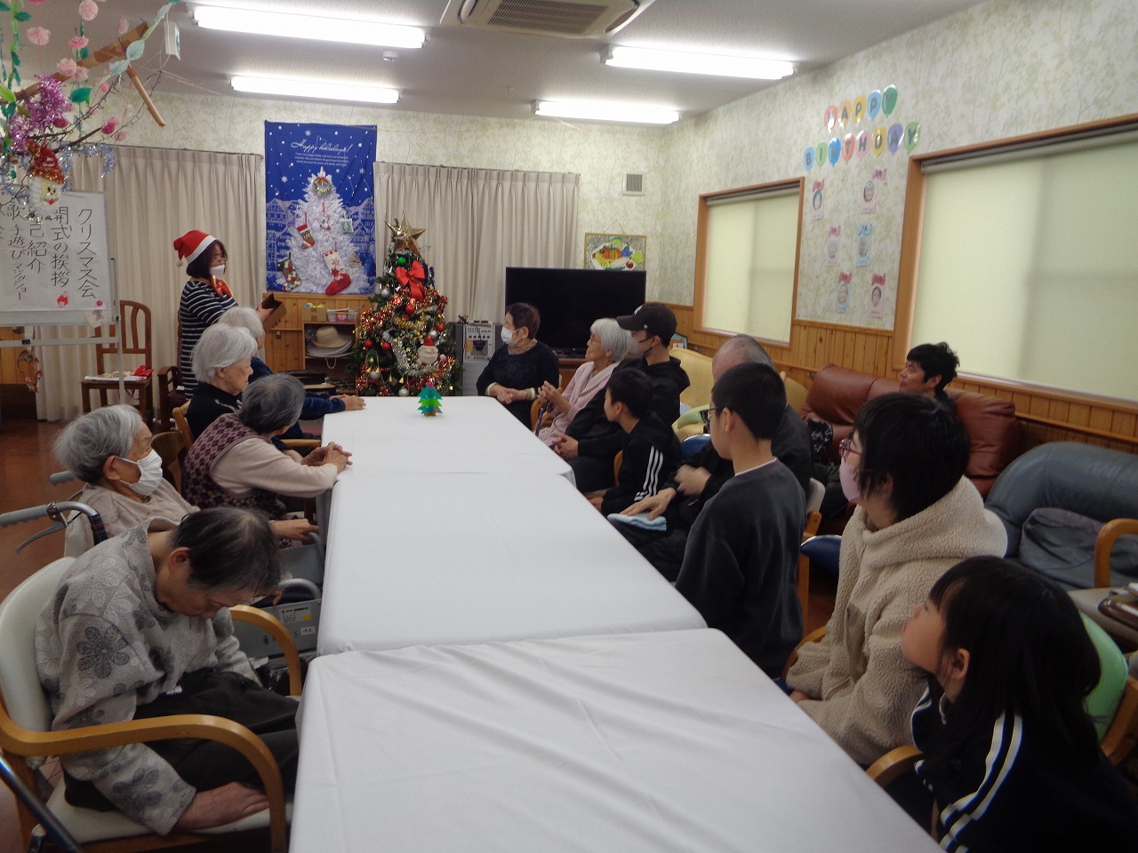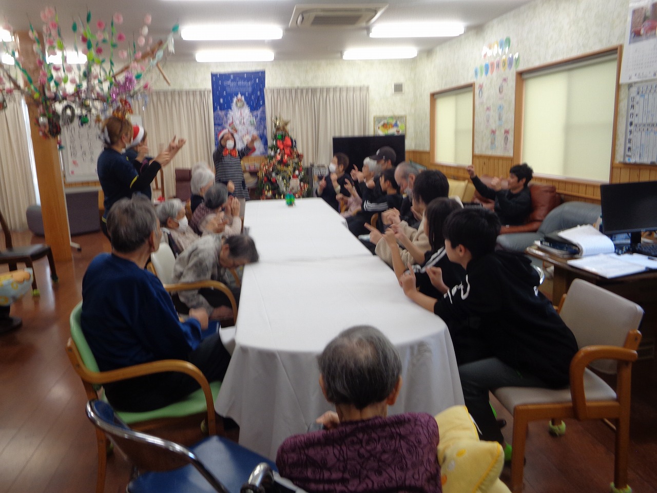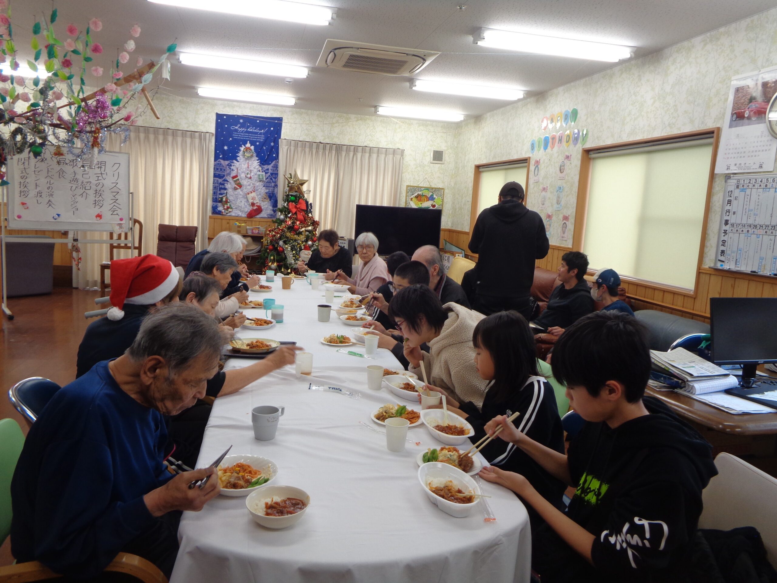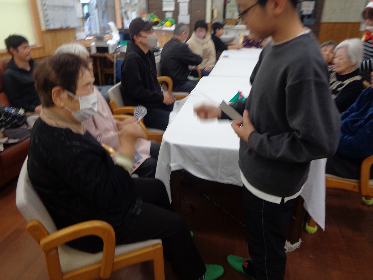 最後の写真はクリスマス会の昼食メニューです。 いつもは食の細い利用者様も子供たちと一緒に召し上がられて嬉しいのでしょう。吃驚するくらい“ペロッ”と召し上がられました。たまにはこんな雰囲気も大切にしたいですね(^^♪。 クリスマス会ではボランティアで参加していただいた元職員さんの手品(子供たちも挑戦したり楽しそうでした。)や指を使っての手遊び(実は脳トレーニングだったり)や、全員参加のじゃんけん大会(時間を忘れるくらいの盛り上がりでした。)で彼方此方で笑い声が上がったりと3時間弱ではありましたが楽しいひと時を過ごさせていただきました。参加してくださった子供たち~ありがとうございました。また遊びに来てくださいね~(@^^)/~~~