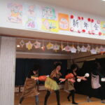 鏡餅を玄関に飾っています。クリスマス会は、サンタより1人ずつプレゼントとサックス演奏がありました。ケーキも食べて楽しい時間を過ごしました。