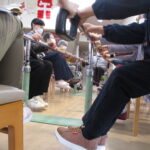ある日のレクリエーション時間では自分の足で新聞紙をどこまで小さく畳めるか!の競争を行い