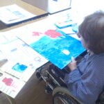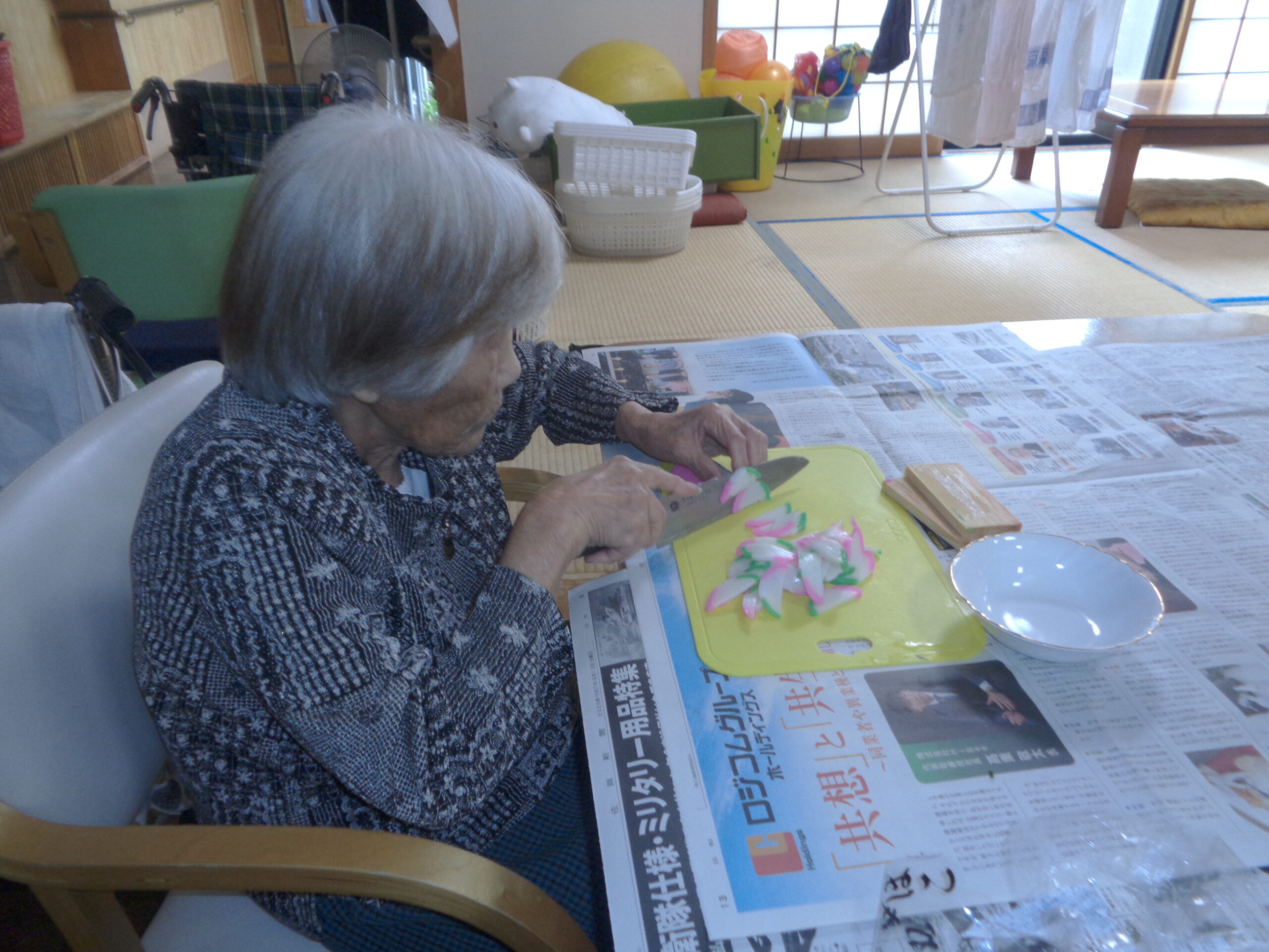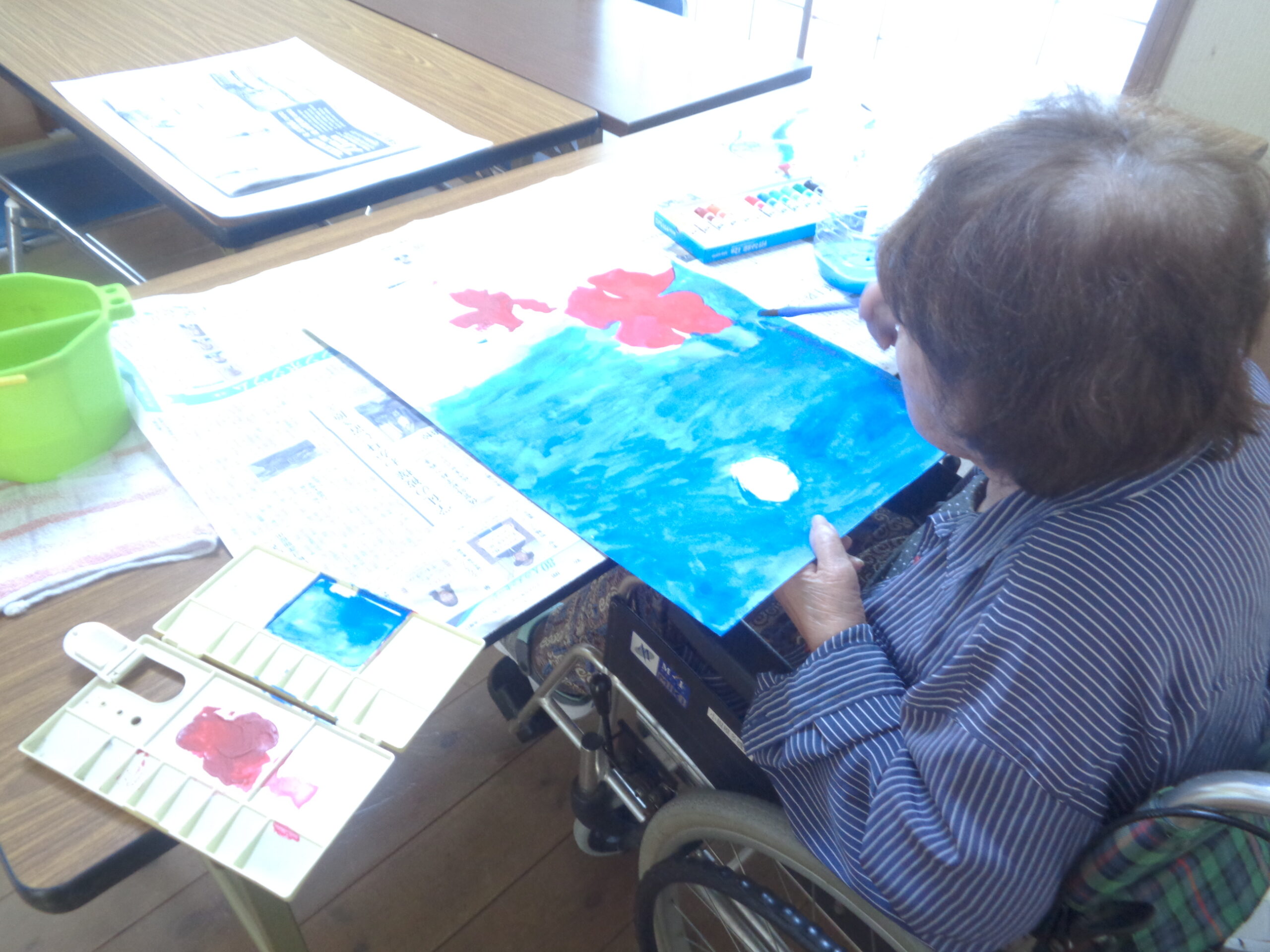 日常では壁画の制作、機能訓練、洗濯物干し、畳み、清掃のお手伝いなど自立支援を念頭に出来ることは、お手伝いをして頂いています。
