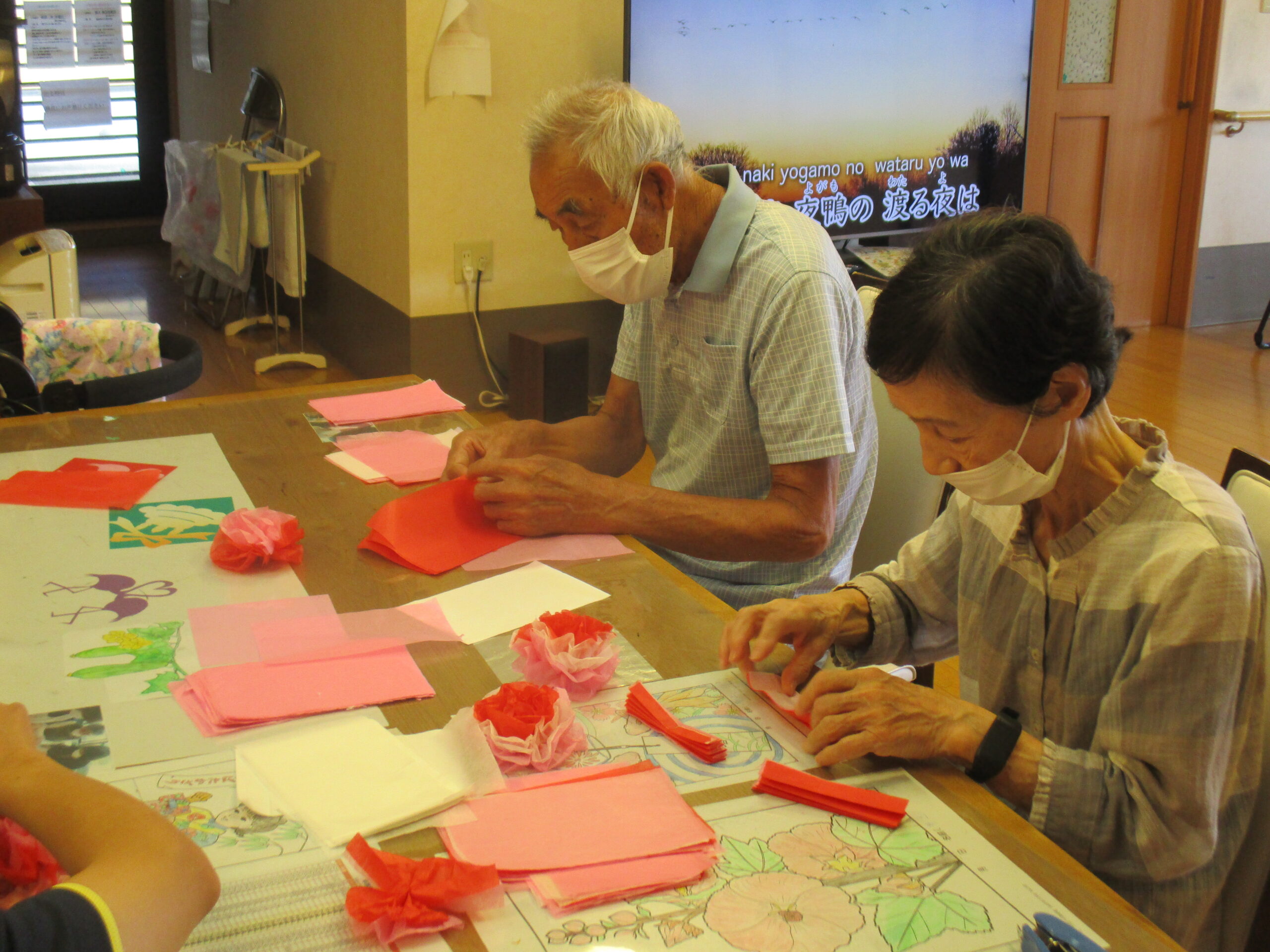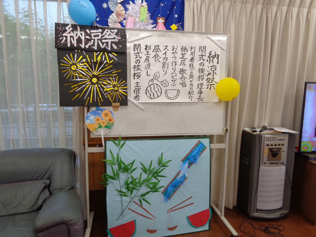 そしてデイサービスでは室内の壁面を夏仕様に仕上げるために皆さん協力して