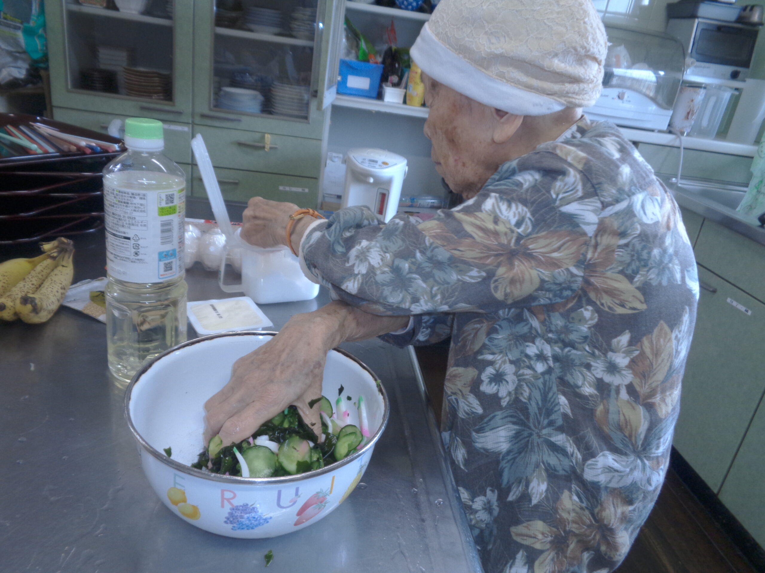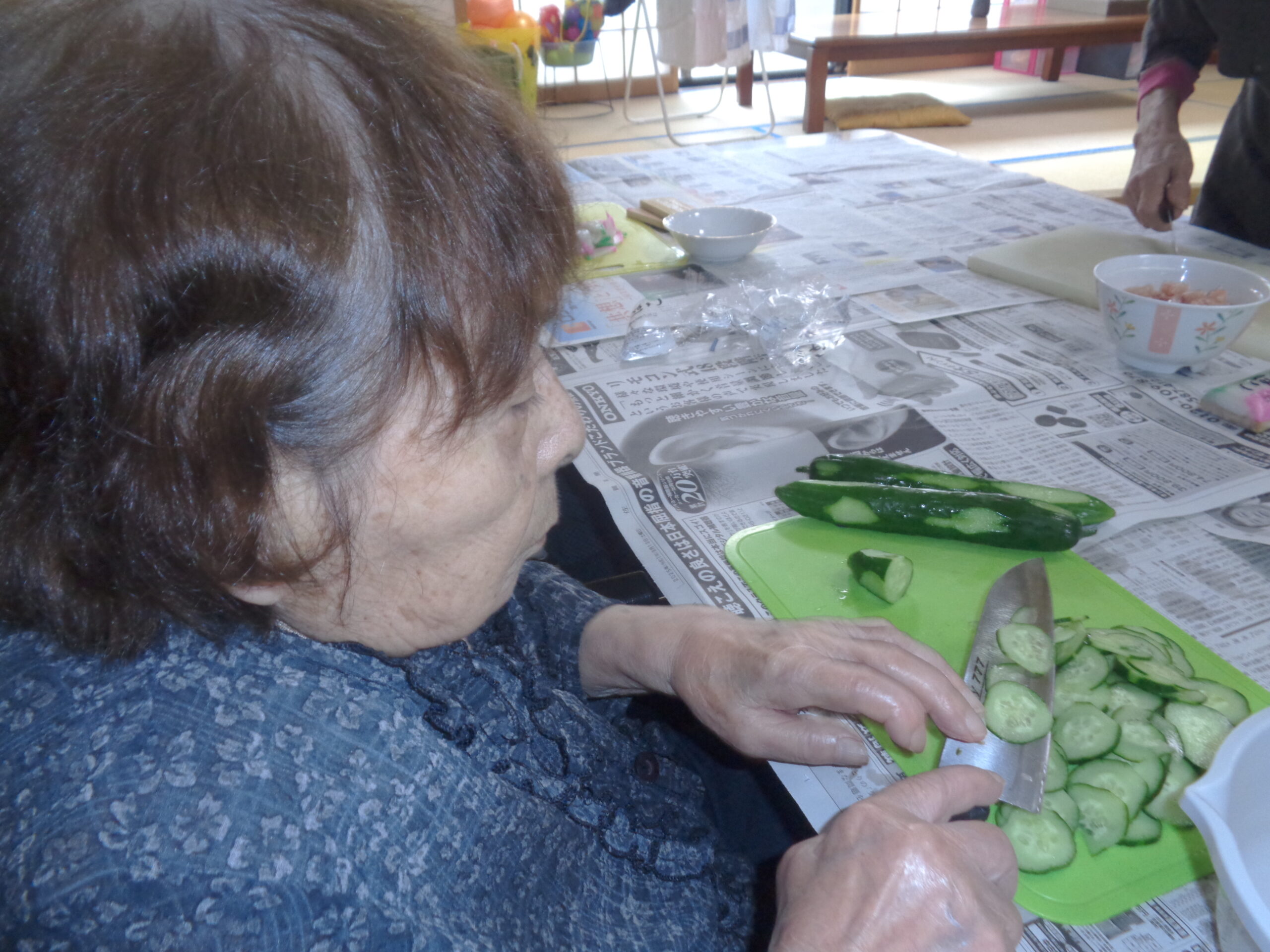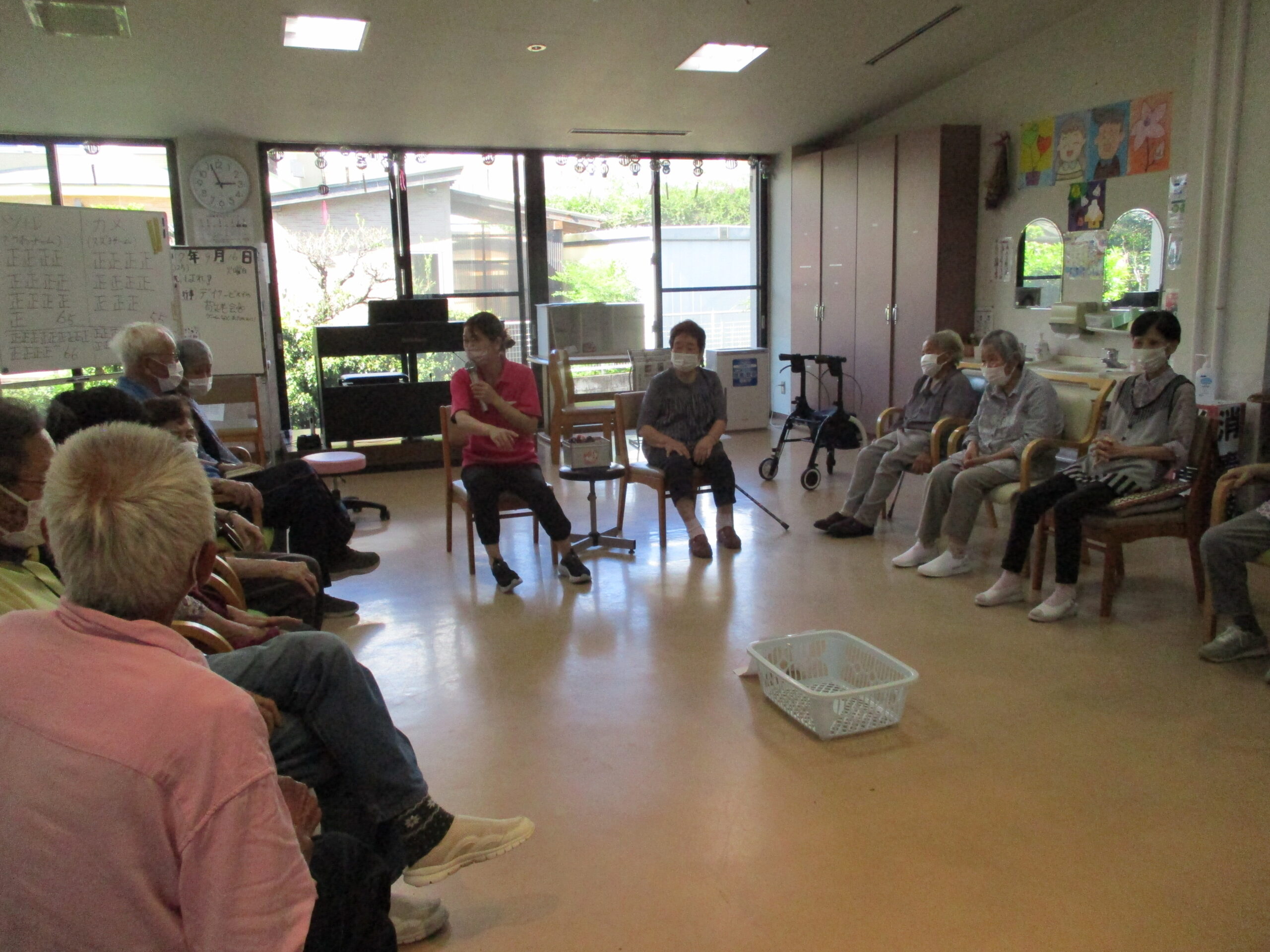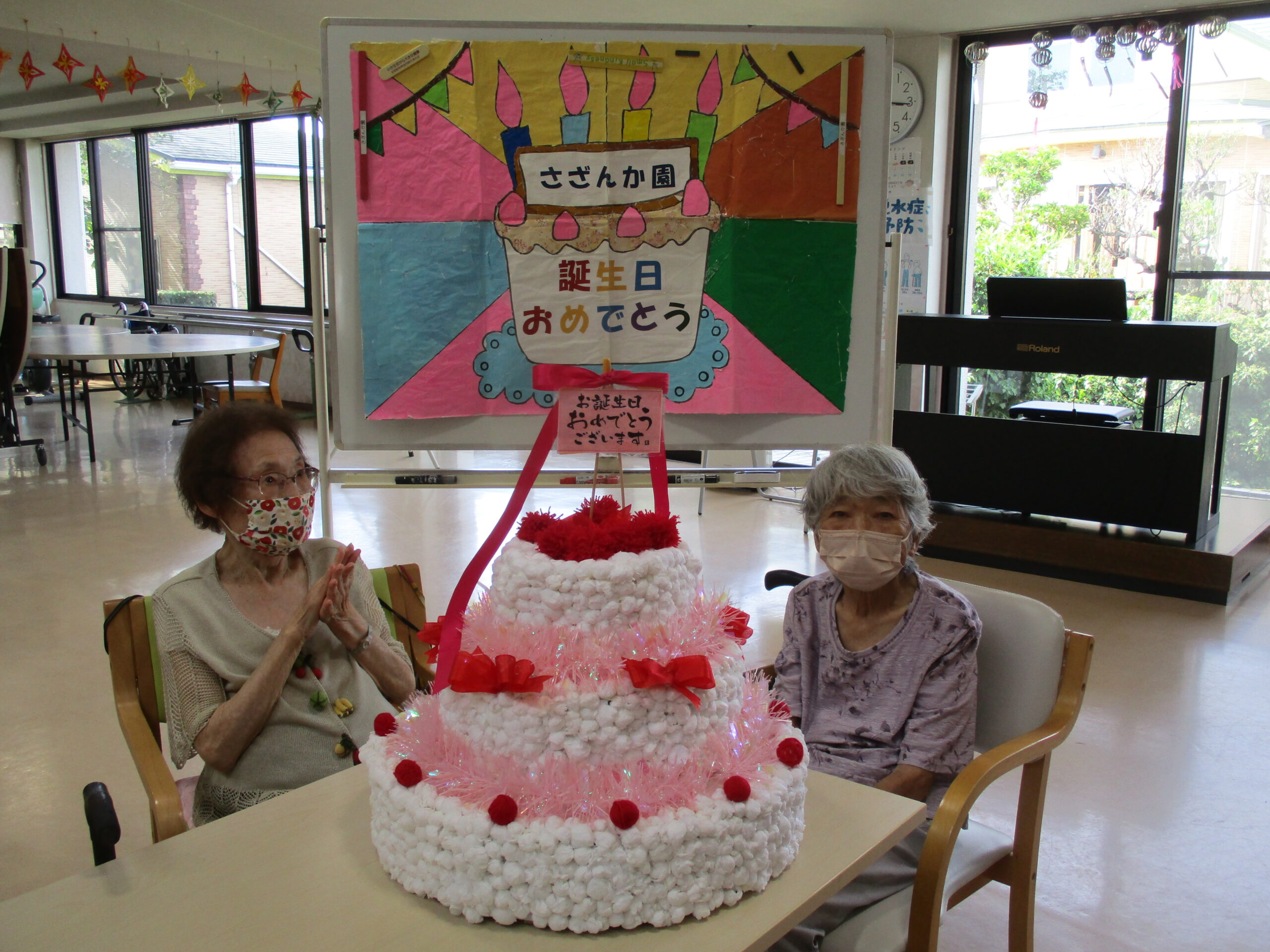 こんにちは~例年以上に暑い夏にも関わらず、利用者様は元気いっぱいに過ごしておられます。 熱中症にかからない様に気を付けて水分補給も忘れずに、暑い日中は室内で楽しんでおられました。7月の誕生日は利用者様のご希望でちらし寿司・お刺身でお祝いしました。暑い夏を乗り切るのにはぴったりな組み合わせだったみたいで皆さまに満足していただけたようです。 まだまだ日差しの強いです。みなさんも水分補強も忘れずに(@^^)/~~~