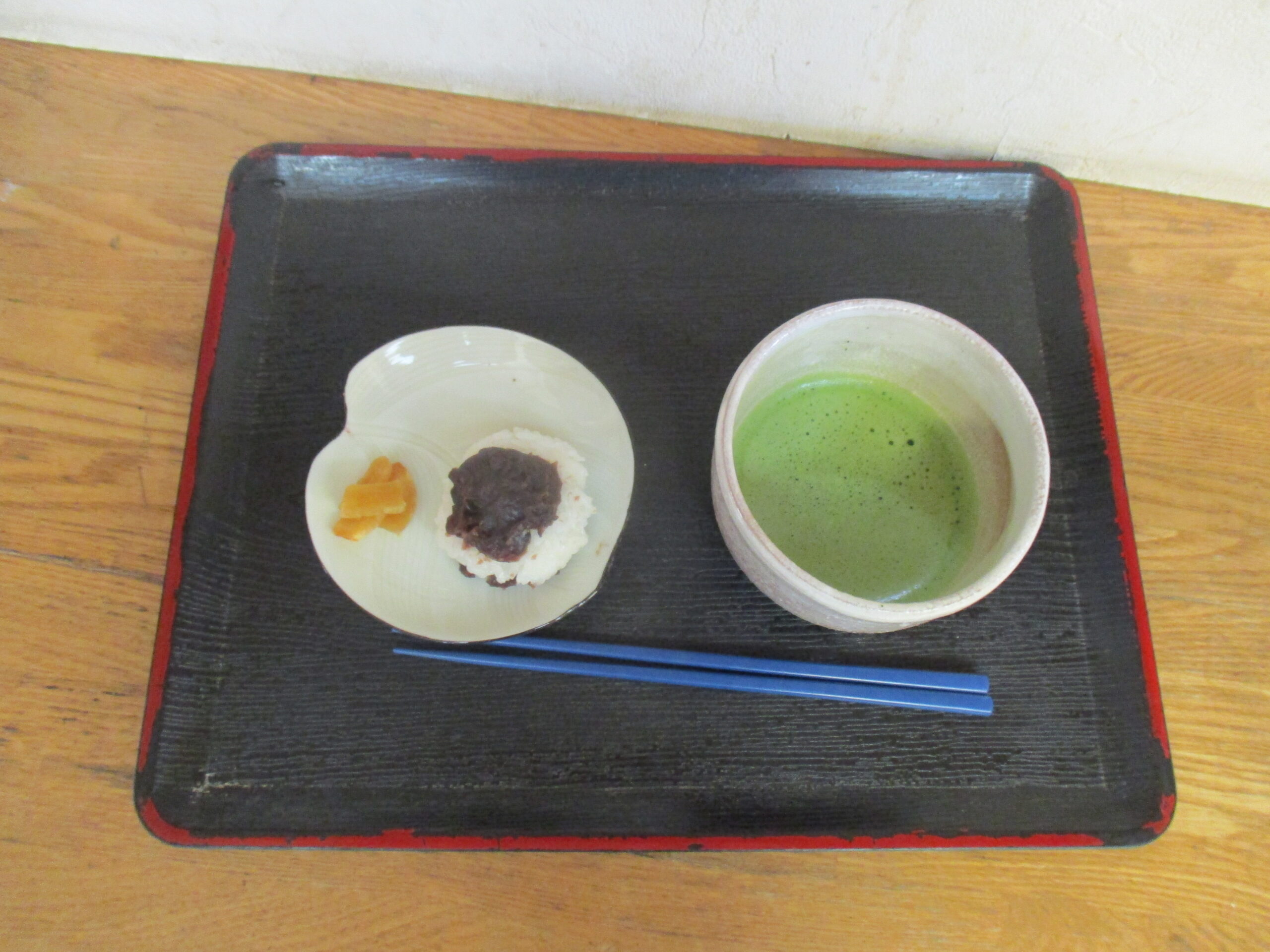 甘いおはぎと渋い抹茶、皆で、お祝いをしました。