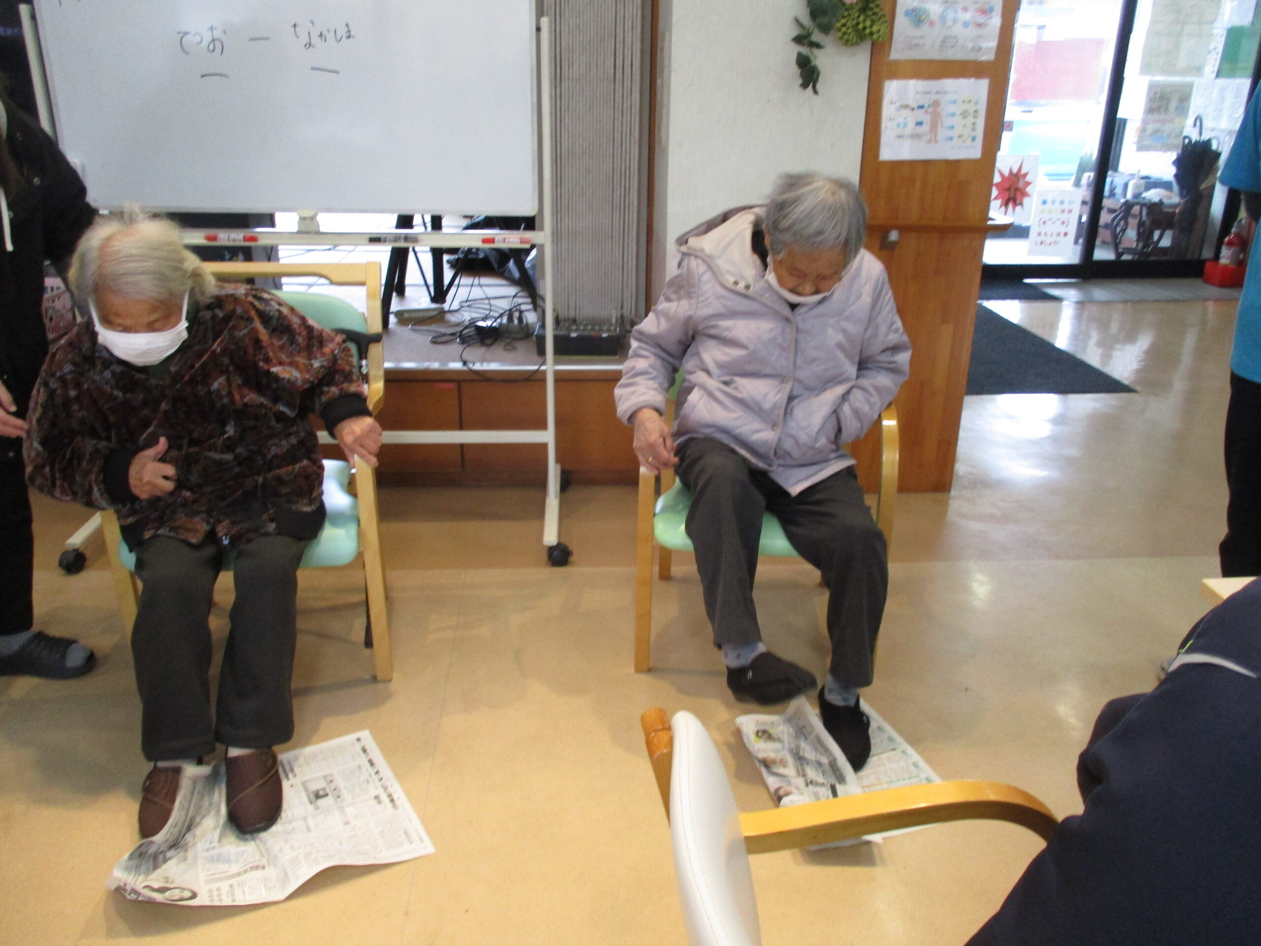ある日のレクリエーション時間では自分の足で新聞紙をどこまで小さく畳めるか!の競争を行い
